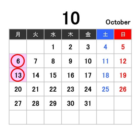 すでに昨日(6日)お休みでしたが、あとは13日(スポーツの日)がお休みです。