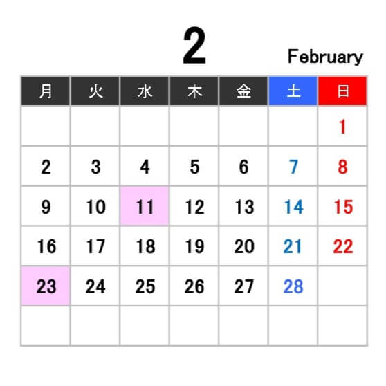 今月は 11日(水):建国記念の日 23日(月):天皇誕生日 です。
